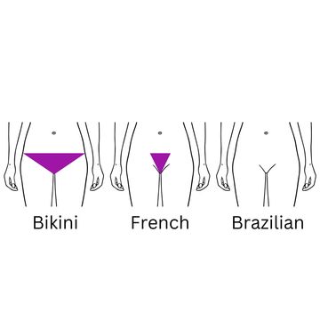 Bikini is anything that would show in a swimsuit. About a hand width outside bikini line and at least one finger width inside. Shape of your choice, stomach strip, and back side of butt cheeks